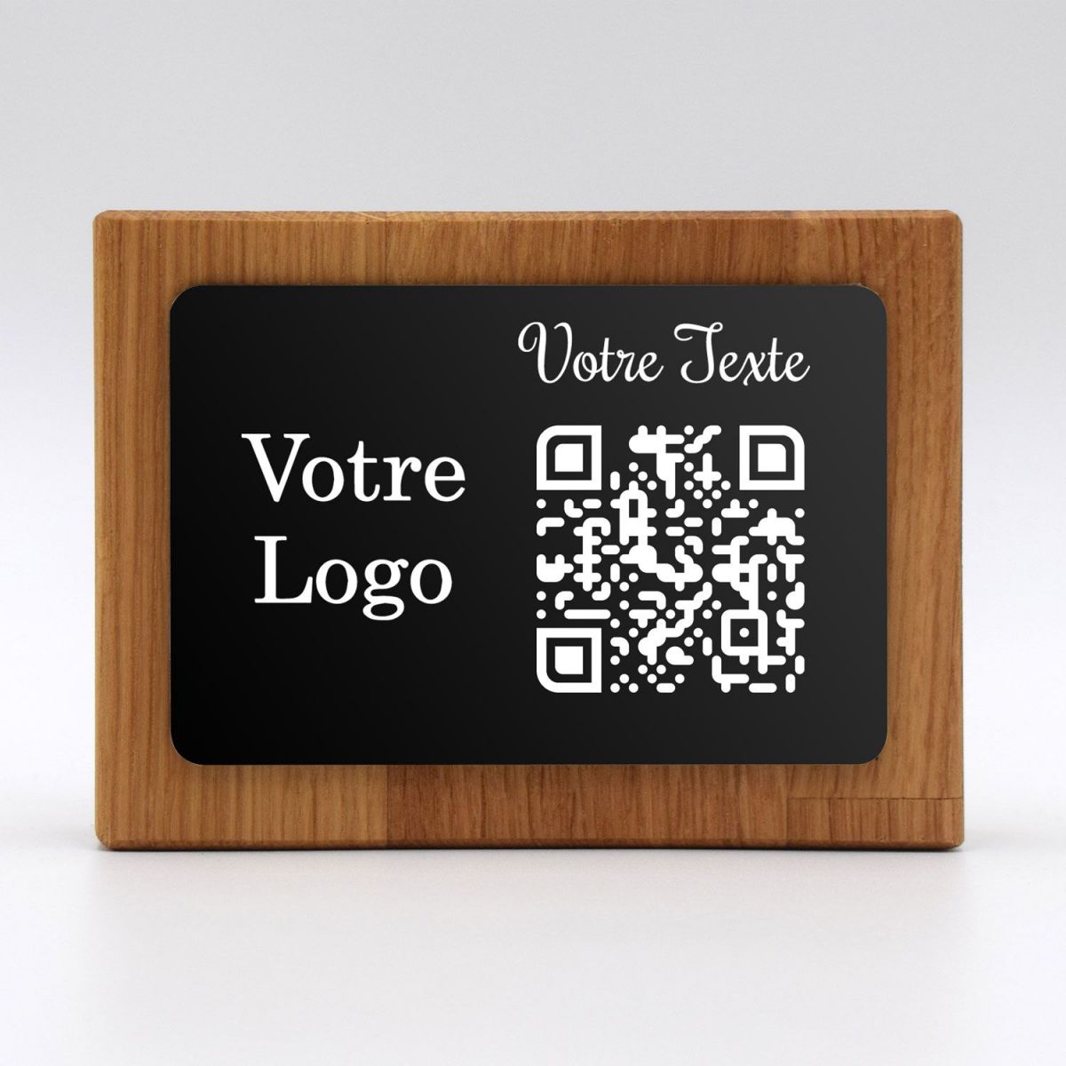 Socle QR Code en bois et étiquette aspect noir brillant.