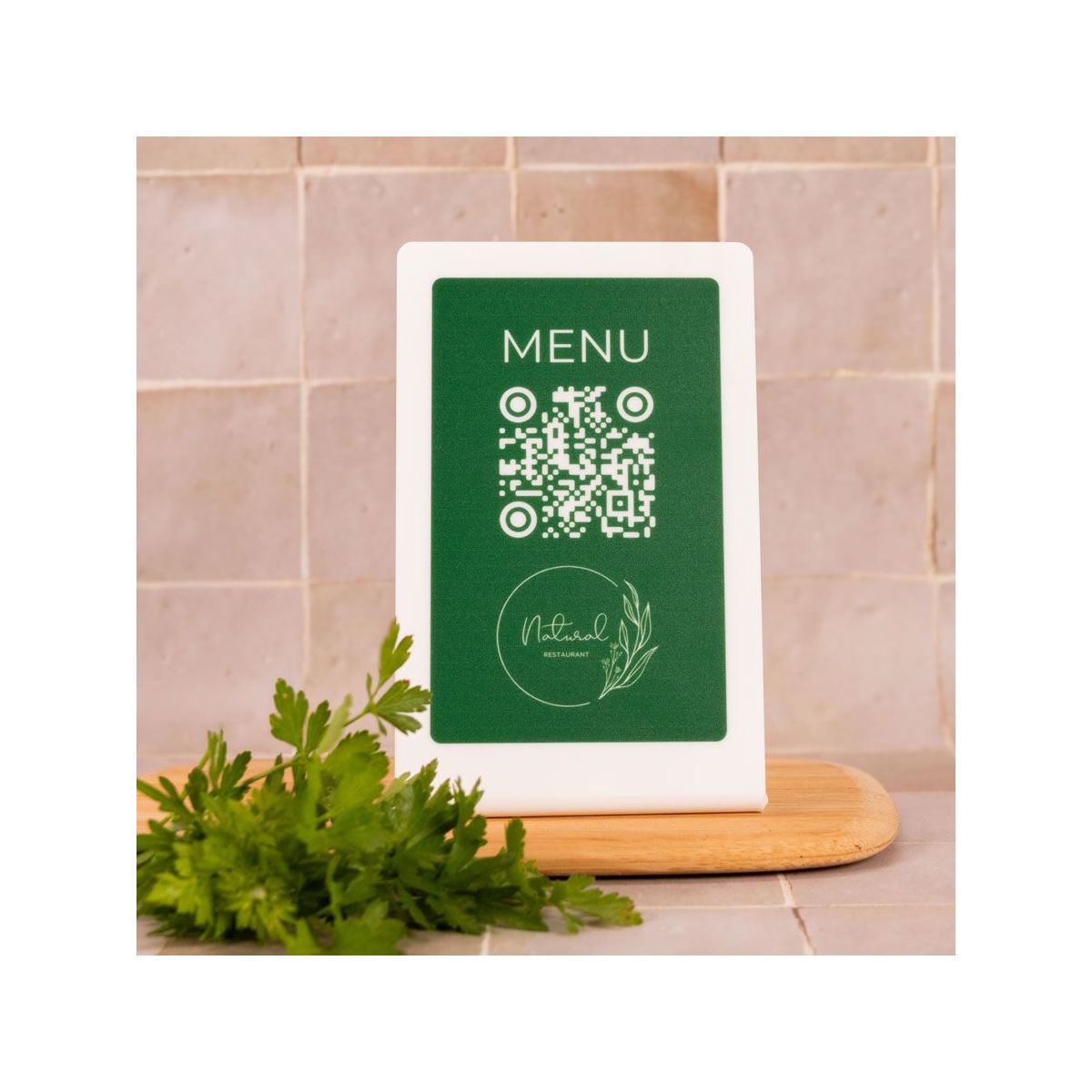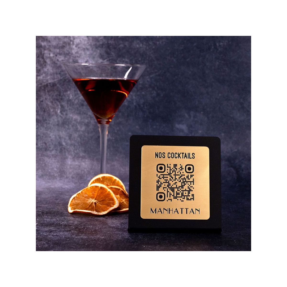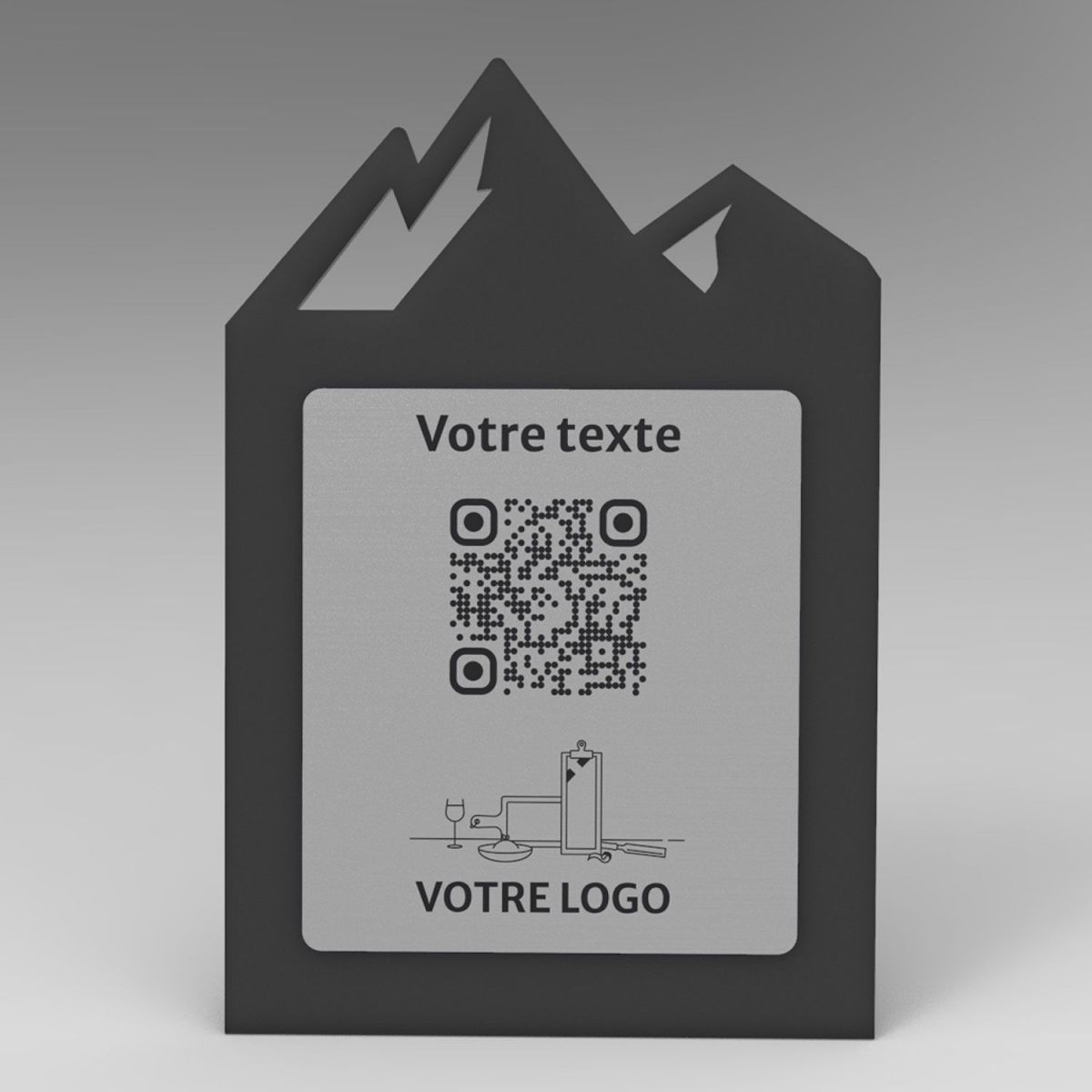 Présentoir incliné noir aspect inox montagne - Support QR Code en plexiglass pour restaurant